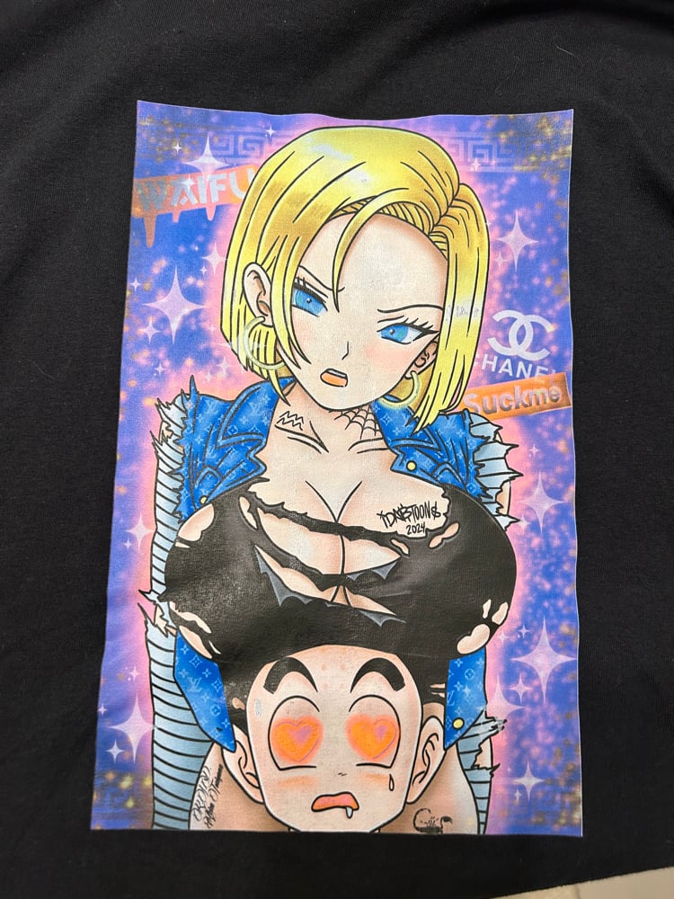 Android 18/krillin UV TSHIRT glows under black light wear your favorite anime's more shirts incoming here's the preorder wait should be about 2 weeks I will not be carrying big stock of tshirt will make them as you place order. thanks for your support DM OR COMMENT ON MY INSTAGRAM ANY DESIGN SUGGESTIONS